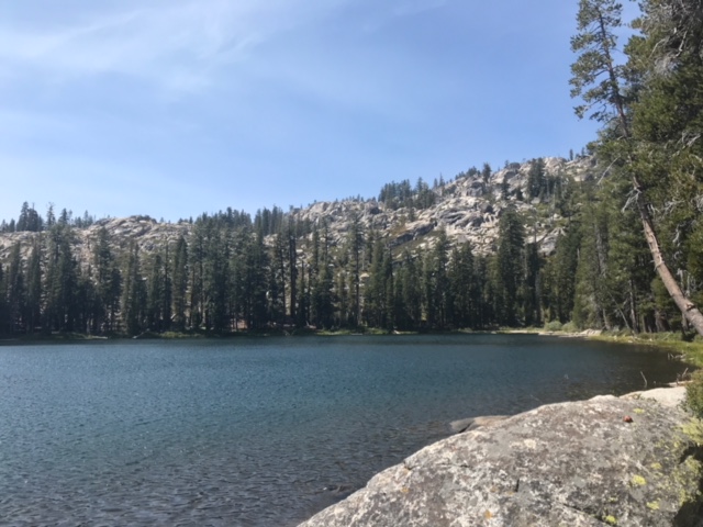 This weekend, we decided to take advantage of the beautiful late summer weather and check out Lower Lola Montez Lake. It is one of those classic small High Sierra lakes, nestled in a forested, shallow granite basin, adorned with boulders perfect for diving or sunbathing, and populated with rainbow trout. The hike to the lake is a moderate out and back, about 6 to 7 miles round trip, and dogs are welcome. The elevation gain is about 700 feet, and the hike took us about three and a half hours, including the time we spent breaking for lunch.